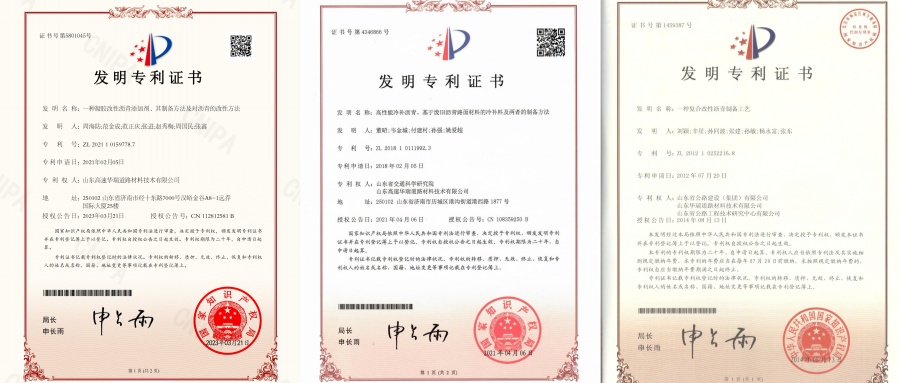 公司研制的MAC改性瀝青獲得了《一種凝膠改性瀝青添加劑、其制備方法及對(duì)瀝青的改性方法》和《高性能冷補(bǔ)瀝青、基于廢舊瀝青路面材料的冷補(bǔ)料及兩者的制備方法》等發(fā)明專利授權(quán)。MAC改性瀝青大碎石柔性基層新型路面結(jié)構(gòu)獲得實(shí)用新型專利證書。
