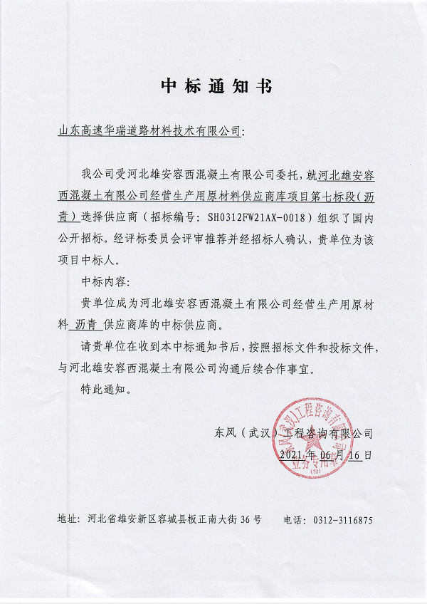 根據(jù)河北雄安容西混凝土有限公司2021年經(jīng)營生產(chǎn)需求,瀝青標段共需各類瀝青約2萬噸(70號瀝青暫估需求量1.5萬噸、改性瀝青SBS I-C暫估需求量0.1萬噸、改性瀝青SBS I-D暫估需求量0.4萬噸),華瑞公司以第二名的成績成功入圍其供應商庫。
