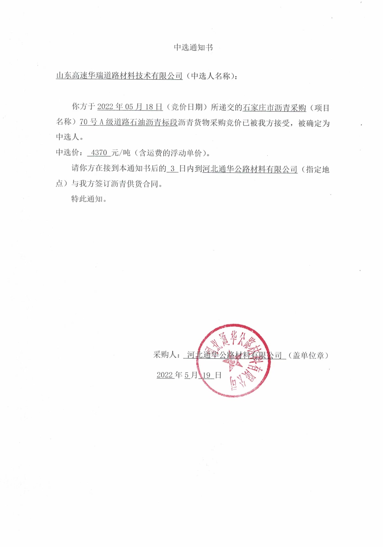 近日,山東高速華瑞公司成功中選河北通華公路材料有限公司石家莊市瀝青采購項(xiàng)目。