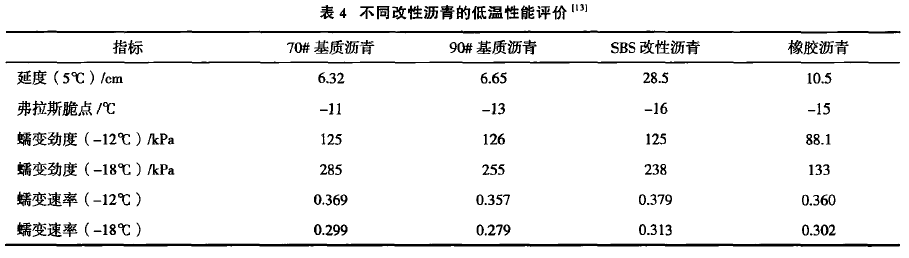 目前巳有大量采用BBR評(píng)價(jià)瀝青低溫性能的研究。Kok等[23]通過試驗(yàn)證實(shí)BBR的測試結(jié)果與混合料低溫性能相關(guān)性較高。隨后,Rezaei[24]運(yùn)用BBR研究了改性劑SBS對(duì)瀝青低溫性能的改善機(jī)理。在此基礎(chǔ)上,馬曉燕等[25]研究了5種基質(zhì)瀝青和5種SBS改性劑對(duì)改性瀝青低溫性能的影響。結(jié)果表明,基質(zhì)瀝青的種類對(duì)改性瀝青的低溫性能起決定性作用,改性劑類型以及改性劑摻量的影響程度依次降低。該結(jié)論也間接說明BBR結(jié)果的精確性遠(yuǎn)高于低溫延度和Frass脆點(diǎn)。此外,董文龍等[26]分別采用線性和星型SBS改性瀝青,并通過BBR分析了不同改性劑的改性效果,結(jié)果表明,星型SBS改性瀝青的低溫性能更佳,這是因?yàn)椴捎眯切蚐BS改性瀝青更有助千構(gòu)建三維交聯(lián)網(wǎng)絡(luò),從而提高瀝青的低溫抗開裂性能。見表4。