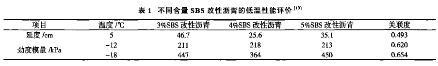 瀝青的延度作為評(píng)價(jià)瀝青常規(guī)性能的三大指標(biāo)之一,由千操作簡便,結(jié)果直觀等優(yōu)勢被廣泛使用。延度表示特定長度的瀝青樣品在指定溫度和拉伸速率時(shí)直至試件拉斷所能進(jìn)行的最大伸長長度。我國現(xiàn)行的《公路改性瀝青路面施工技術(shù)規(guī)范》采用5℃延度作為評(píng)價(jià)改性瀝青低溫抗裂性能的重要指標(biāo)。相同溫度時(shí),延度越大,表明瀝青的低溫性能越好。不同含量SBS改性瀝青的低溫性能評(píng)價(jià)見表1。
