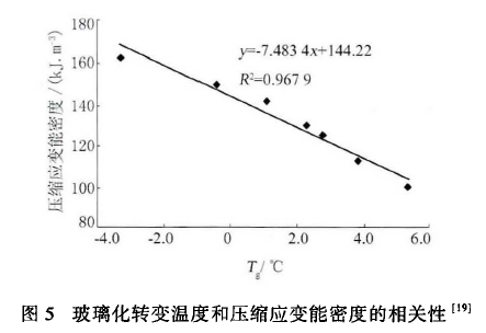 材料的玻璃化轉(zhuǎn)變溫度可由升降溫過程中物理性質(zhì)(如體積、熱力學(xué)性質(zhì)、電磁性質(zhì)以及力學(xué)性質(zhì))突變所對(duì)應(yīng)的溫度確定。其中,示差掃描量熱法(DSC)由于樣品用量少,測試精度高,被廣泛用于材料玻璃化轉(zhuǎn)變溫度的確定。Zhang等(20]通過大量DSC試驗(yàn)證實(shí)改性瀝青的玻璃化轉(zhuǎn)變溫度與其低溫性能存在直接對(duì)應(yīng)關(guān)系,說明采用玻璃化轉(zhuǎn)變溫度表征聚合物改性瀝青的低溫性能具有理論和實(shí)際可行性。不同的聚合物改性瀝青對(duì)應(yīng)不同的玻璃化轉(zhuǎn)變溫度,這是因?yàn)榫酆衔锎嬖诓煌慕Y(jié)晶形態(tài)和吸放熱,同時(shí)聚合物與瀝青的相容性以及兩者相互作用不同[19,21]。動(dòng)態(tài)力學(xué)分析法(DMA)通過測定瀝青材料的動(dòng)態(tài)力學(xué)譜以確定玻璃化轉(zhuǎn)變溫度。牛巖等[22]利用DMA在彎拉受力模式下得到了基質(zhì)瀝青、SBS改性瀝青以及橡膠瀝青及其混合料的玻璃化轉(zhuǎn)變溫度。研究發(fā)現(xiàn),不同改性瀝青及其混合料的玻璃化轉(zhuǎn)變溫度區(qū)分明顯,與混合料的低溫性能相關(guān)性好;相比改性瀝青的玻璃化轉(zhuǎn)變溫度,采用混合料的玻璃化轉(zhuǎn)變溫度評(píng)價(jià)其低溫性能更加合理。然而,與延度和弗拉斯脆點(diǎn)法相比,采用玻璃化轉(zhuǎn)變溫度評(píng)價(jià)改性瀝青低溫性能的研究較少,涉及的改性瀝青種類有限,因此仍需進(jìn)一步開展相關(guān)研究。5種改性瀝青的延度和玻璃化轉(zhuǎn)變溫度比較見表3。玻璃化轉(zhuǎn)變溫度和壓縮應(yīng)變能密度的相關(guān)性[19]見圖5。