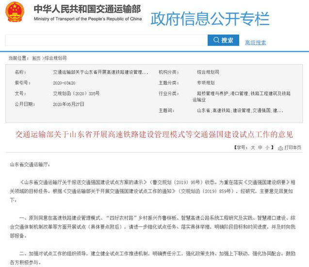 齊魯網(wǎng)·閃電新聞5月27日訊 日前,交通運輸部官網(wǎng)發(fā)布《交通運輸部關(guān)于開展高速鐵路建設(shè)管理模式等交通強國建設(shè)試點工作的意見》(以下簡稱意見)。意見明確,原則同意在高速鐵路建設(shè)管理模式、“四好農(nóng)村路”鄉(xiāng)村振興齊魯樣板、智慧高速公路系統(tǒng)工程研究及實踐、智慧港口建設(shè)、綜合交通體制機制改革等方面開展試點。