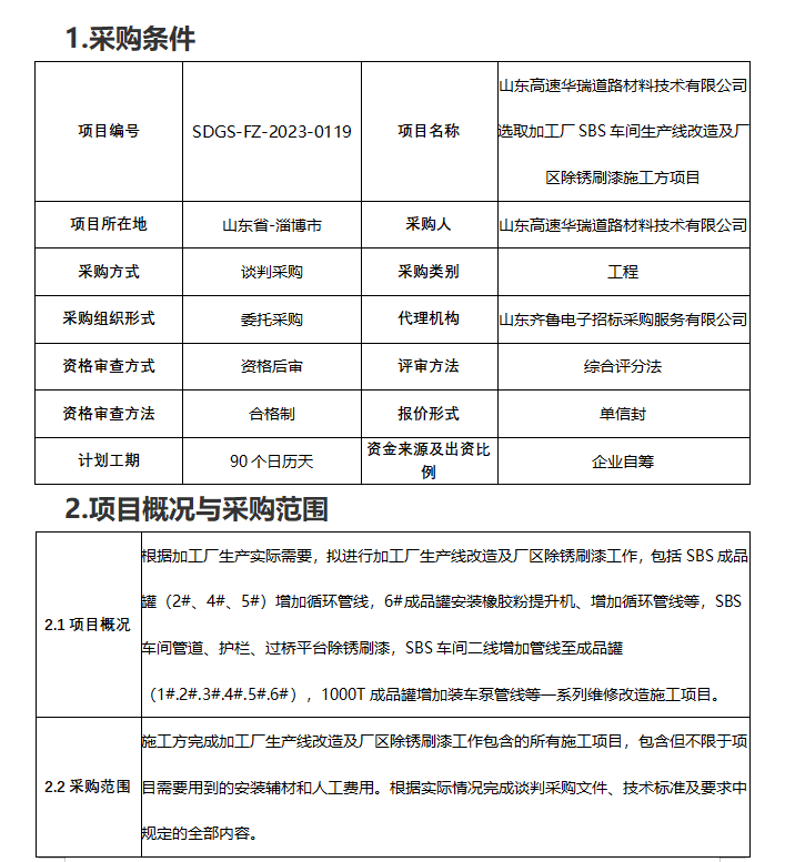 山東高速華瑞道路材料技術(shù)有限公司選取加工廠SBS車間生產(chǎn)線改造及廠區(qū)除銹刷漆施工方項(xiàng)目談判采購(gòu)公告
