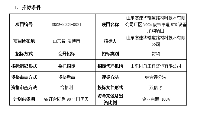 山東高速華瑞道路材料技術有限公司 廠區(qū)VOCs廢氣治理RTO設備采購項目招標公告